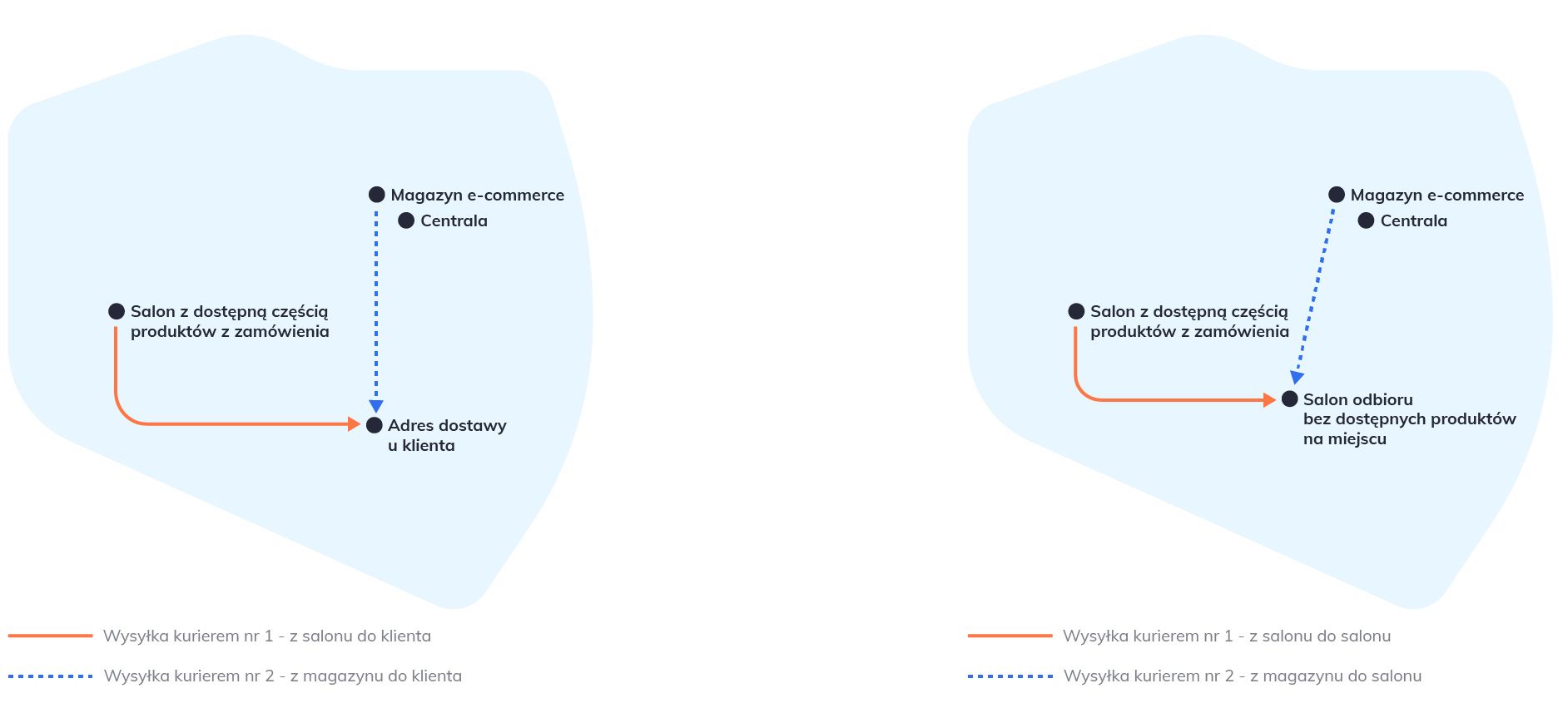 Zdarzają się sytuacje, w których klienci wybierają produkty dostępne w różnych miejscach (magazyn centralny i salon w jednym mieście) oraz dostawę kurierem lub odbiór osobisty w innym mieście. Sieć przyjęła tutaj model maksymalnie dwóch wysyłek realizujących jedno zamówienie. Czasami jest to wysyłka z salonu i z magazynu do innego salonu (w którym klient odbiera zakupy osobiście), a czasami jest to niezależna wysyłka z salonu i magazynu do klienta kurierem. Przyjęcie modelu nie więcej niż dwóch przesyłek ma na celu optymalne wykorzystanie zasobów.