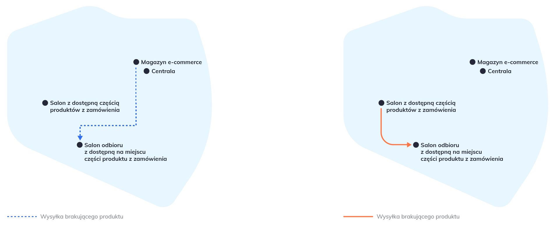 Kompletacja zamówienia może odbywać się z różnych lokalizacji. W takim przypadku z magazynu e-sklepu dosyłane są brakujące części zamówienia. Taka kompletacja może być także realizowana za pośrednictwem innego salonu stacjonarnego sieci. Produkty niedostępne w salonie wybranym przez klienta mogą zostać wysłane w całości z magazynu centralnego, w całości przez inny salon lub w części przez magazyn centralny i inny salon stacjonarny.